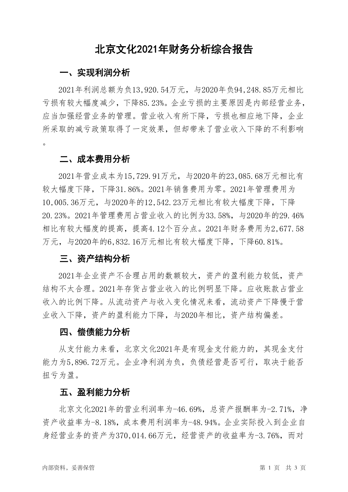 000802北京文化2021年财务分析结论报告