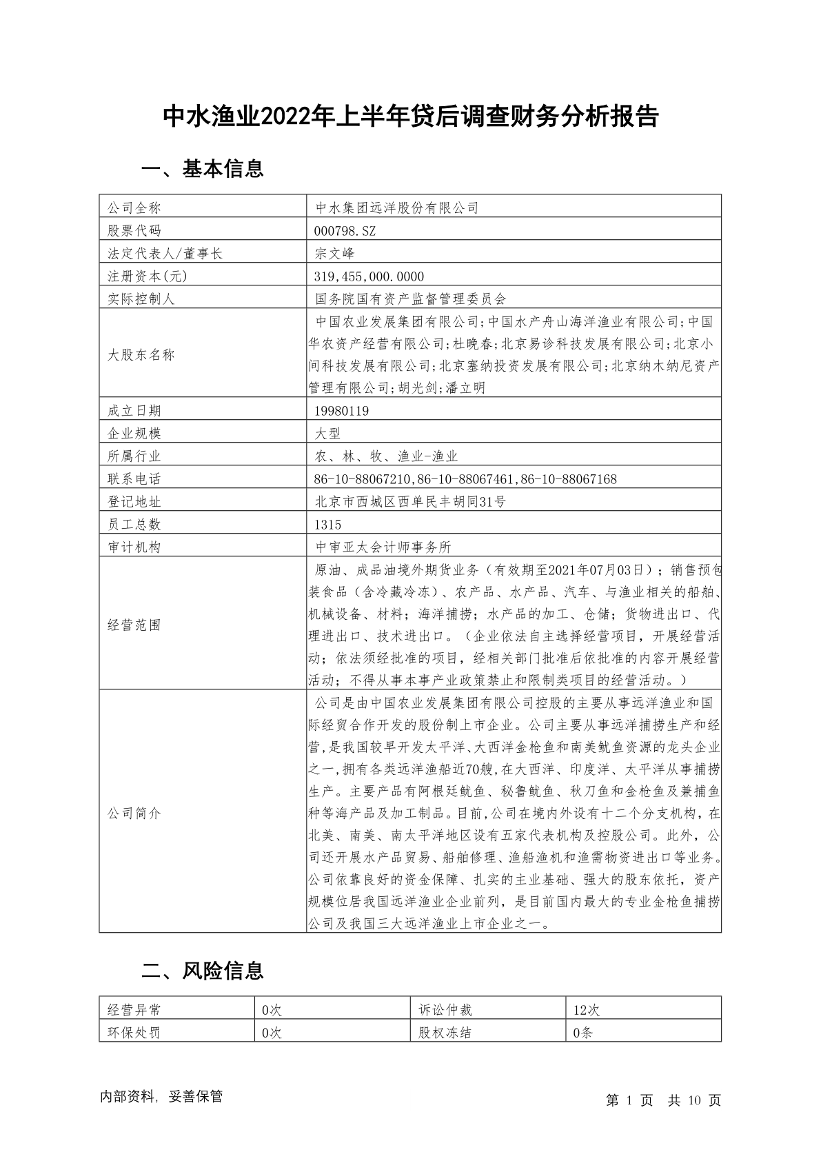 000798中水渔业2022年上半年贷后调查财务分析报告