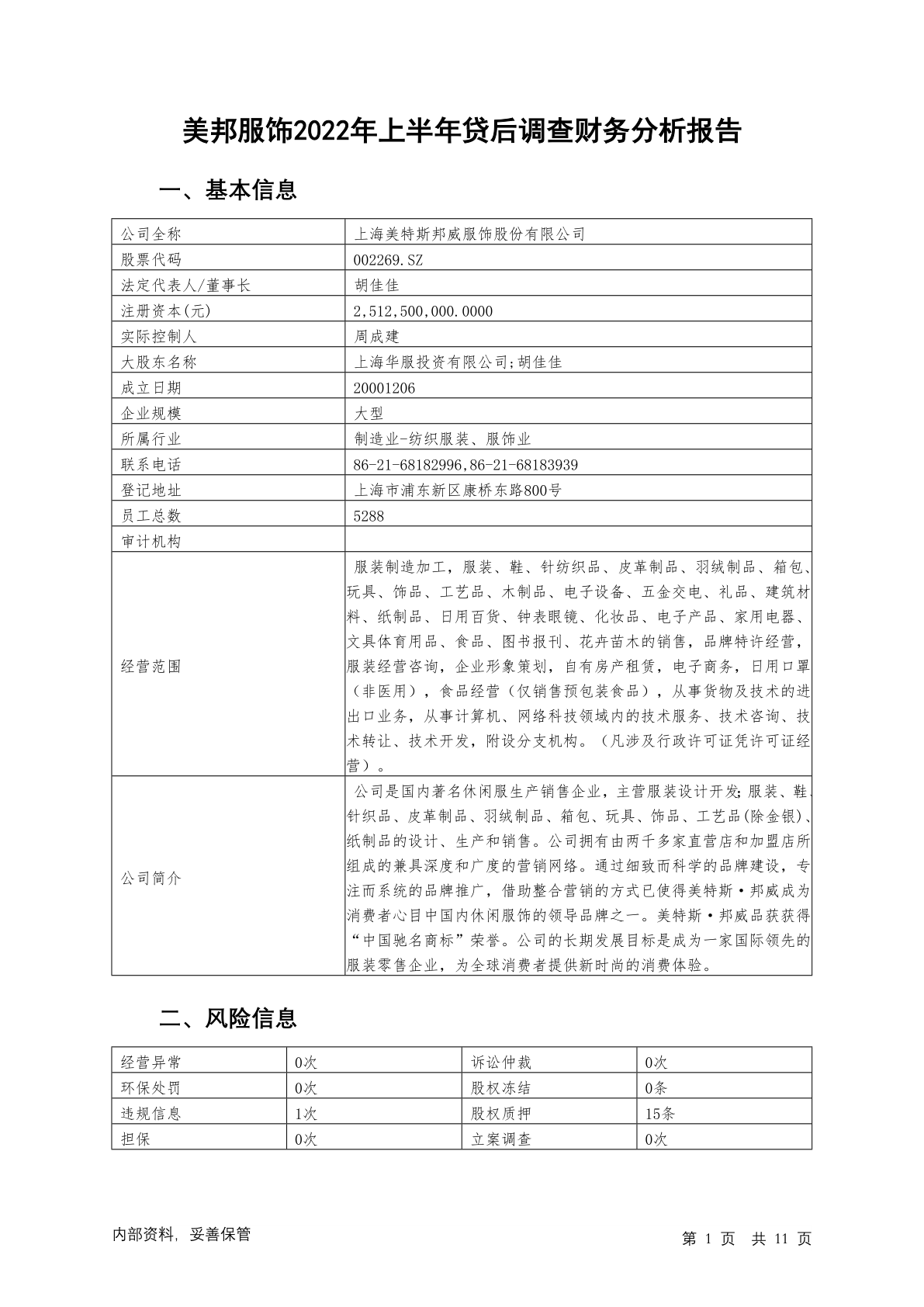 002269美邦服饰2022年上半年贷后调查财务分析报告