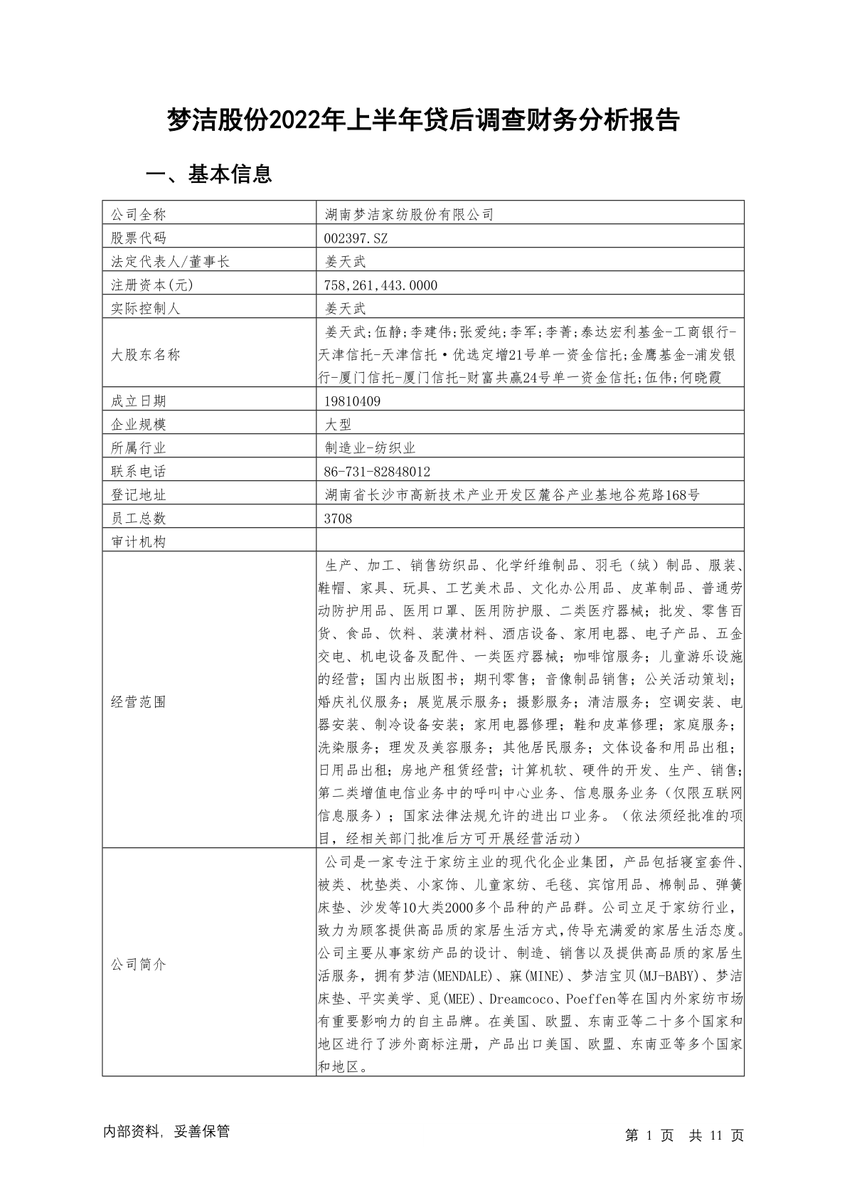 002397梦洁股份2022年上半年贷后调查财务分析报告
