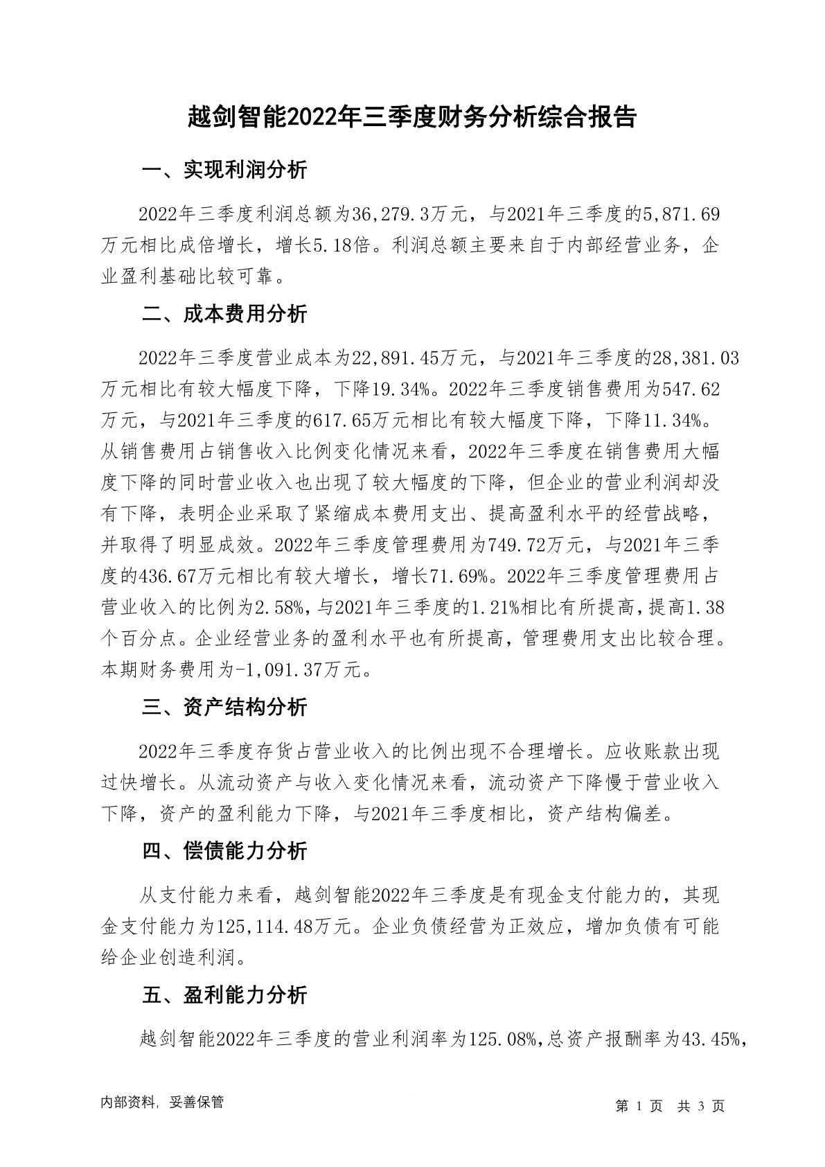 603095越剑智能2022年三季度财务分析结论报告