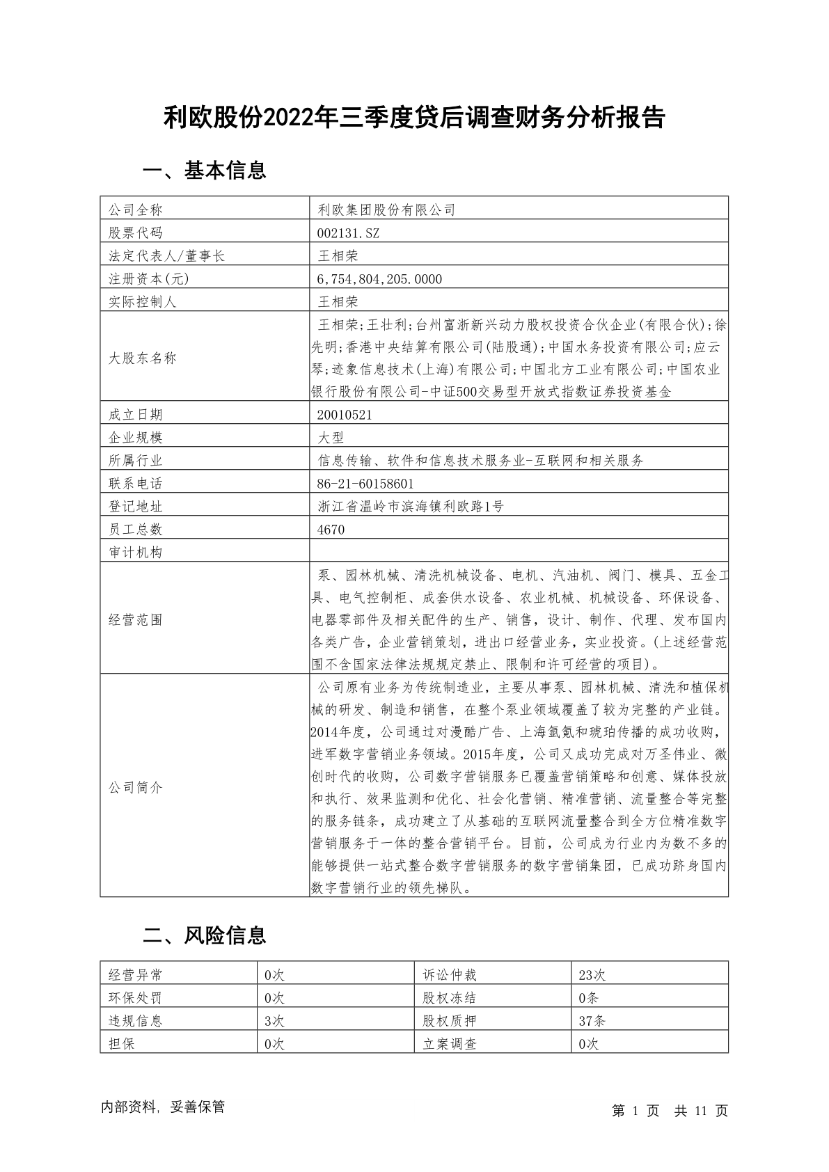 002131利欧股份2022年三季度贷后调查财务分析报告