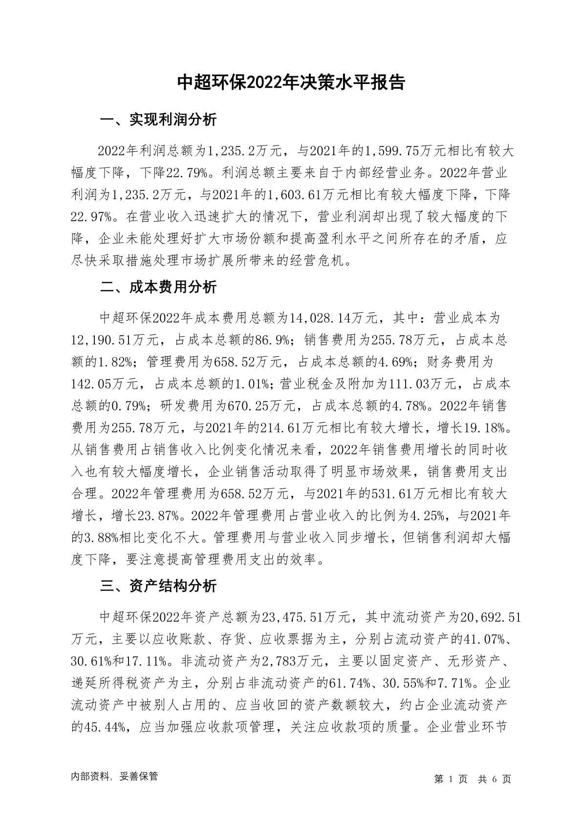 833813中超环保2022年决策水平分析报告