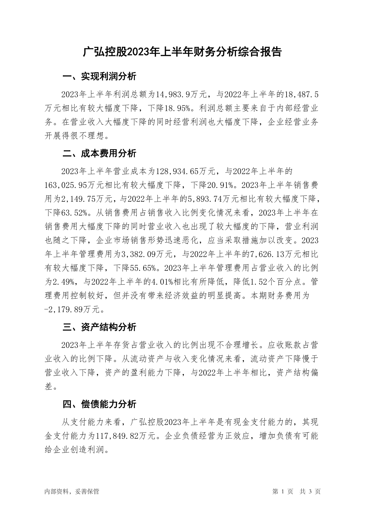000529广弘控股2023年上半年财务分析结论报告