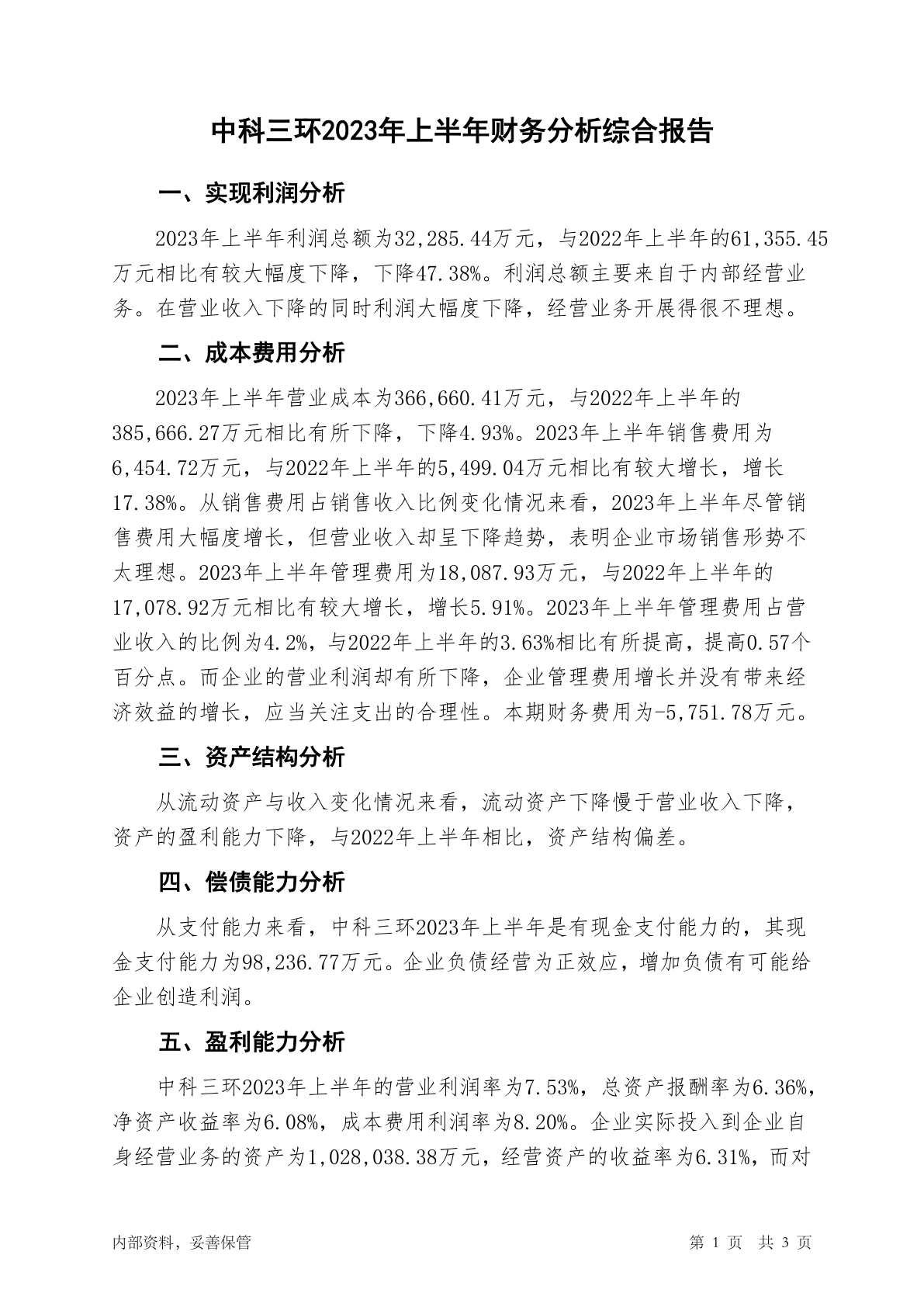 000970中科三环2023年上半年财务分析结论报告