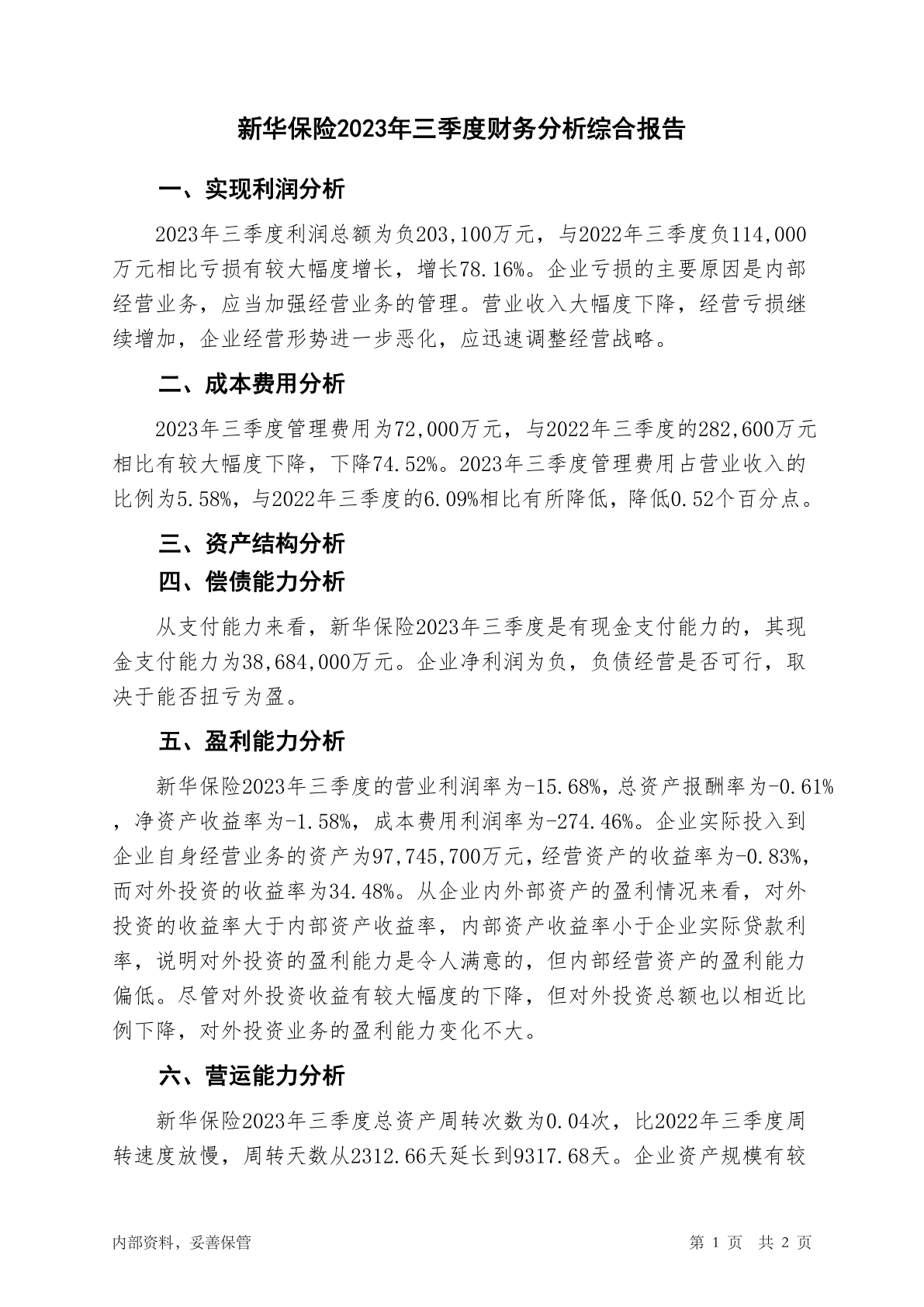 601336新华保险2023年三季度财务分析结论报告