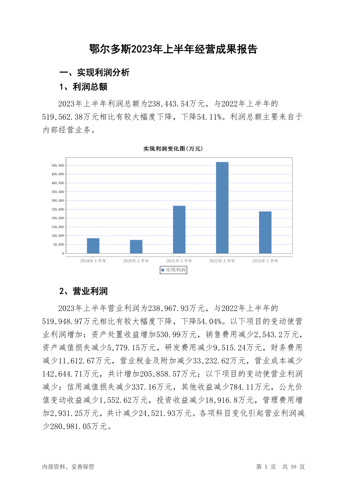 600295鄂尔多斯2023年上半年经营成果报告