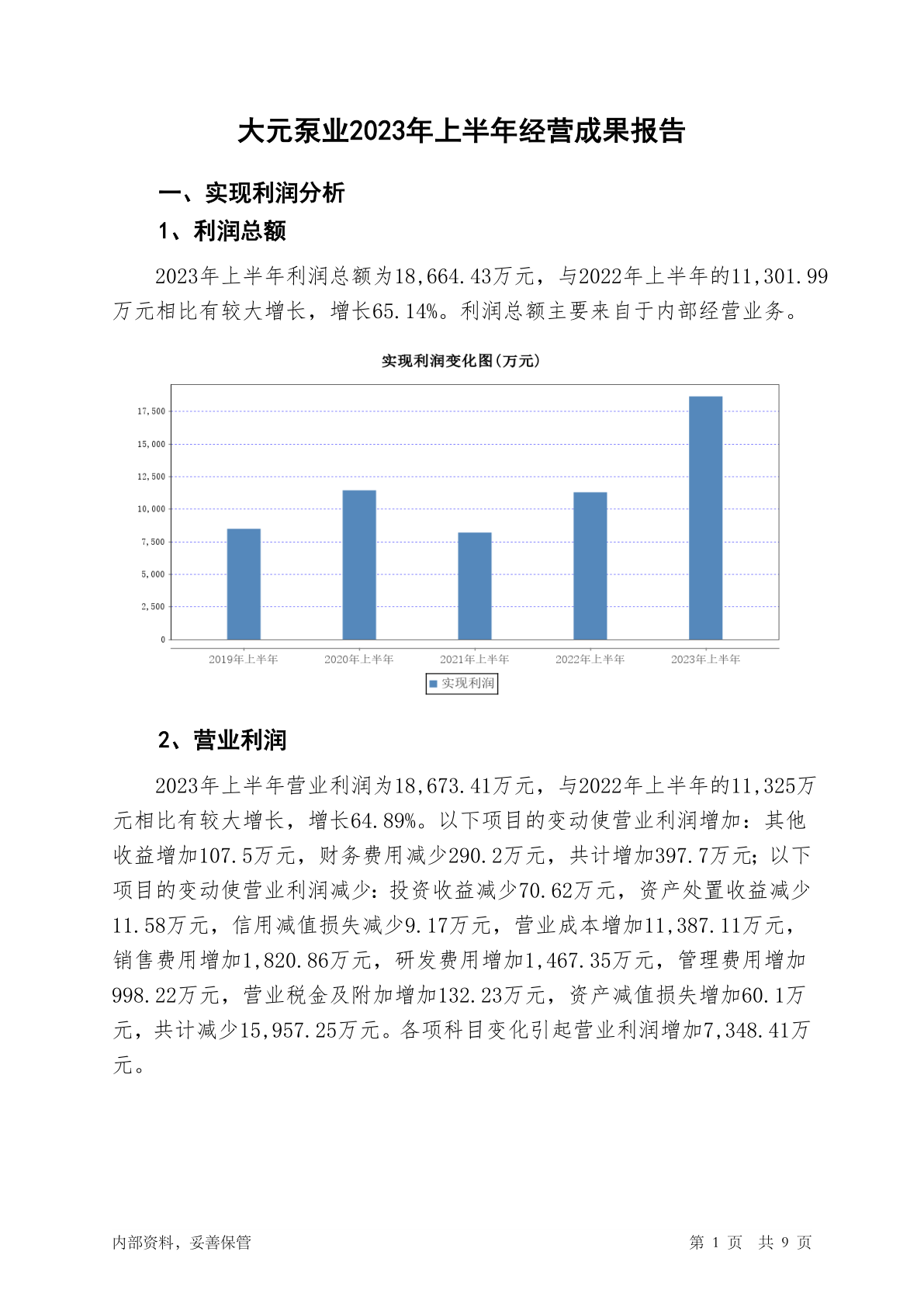 603757大元泵业2023年上半年经营成果报告