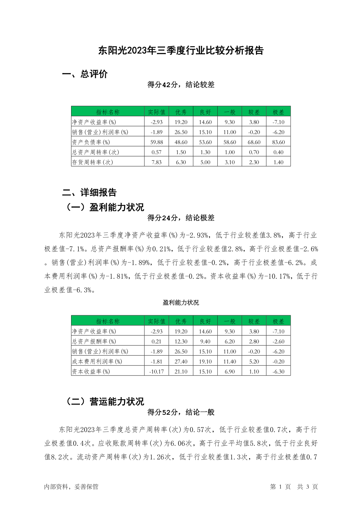 600673东阳光2023年三季度行业比较分析报告