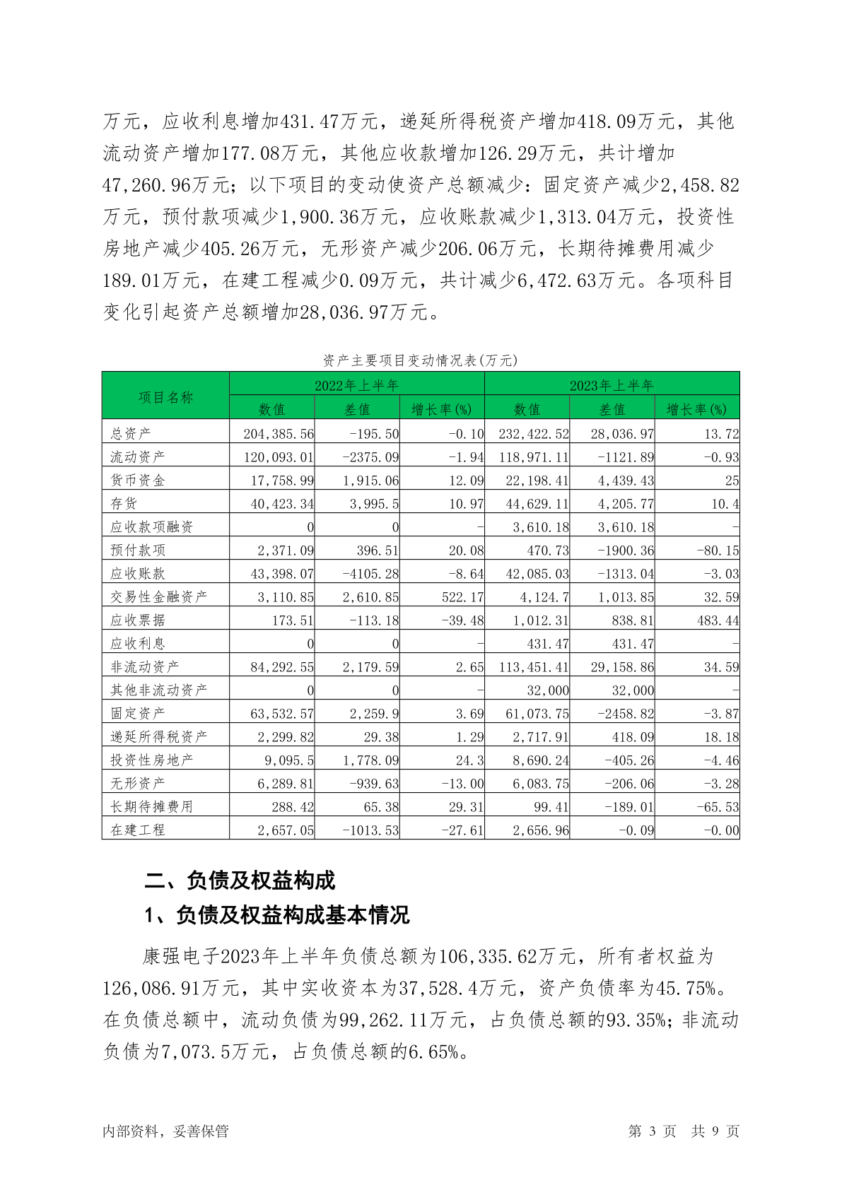 002119康强电子2023年上半年财务状况报告