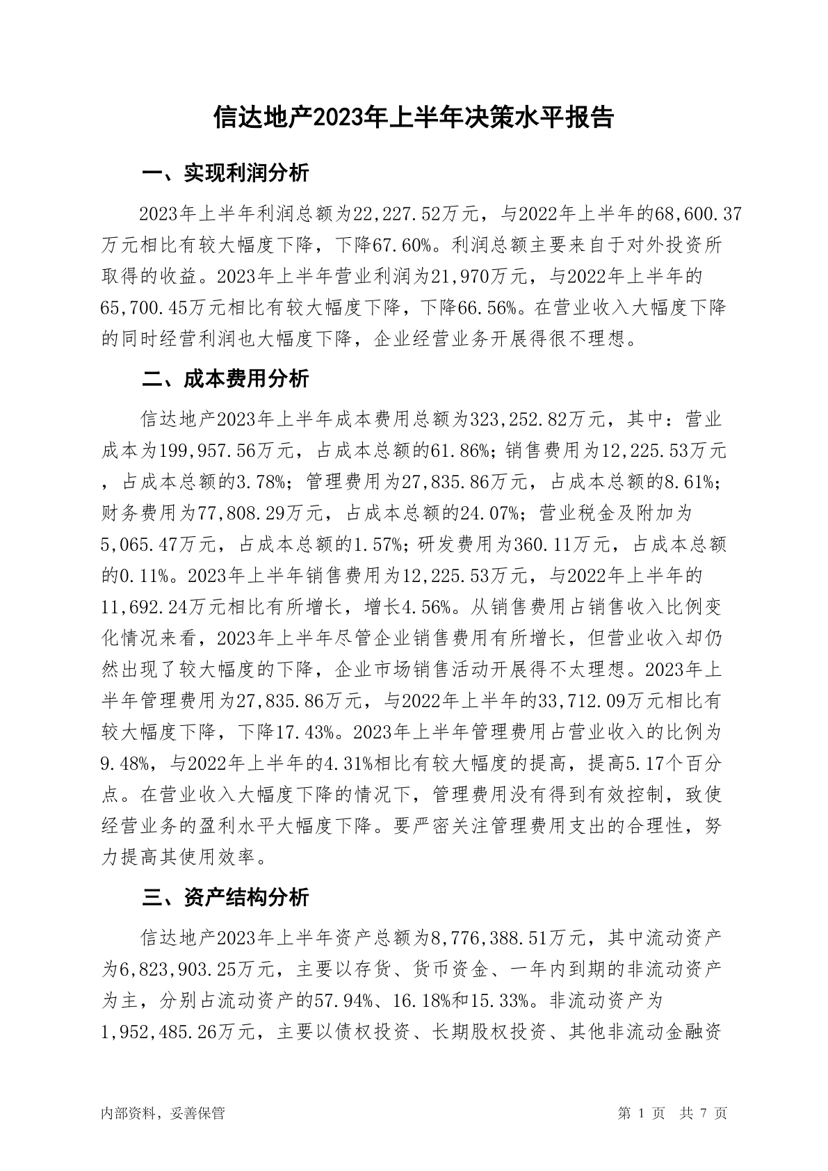 600657信达地产2023年上半年决策水平分析报告
