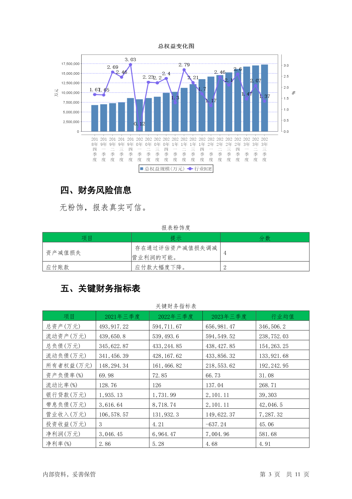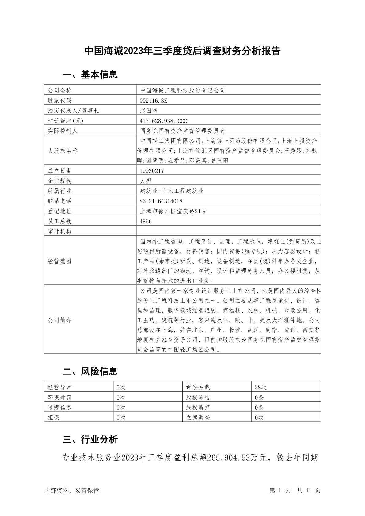 002116中国海诚2023年三季度贷后调查财务分析报告