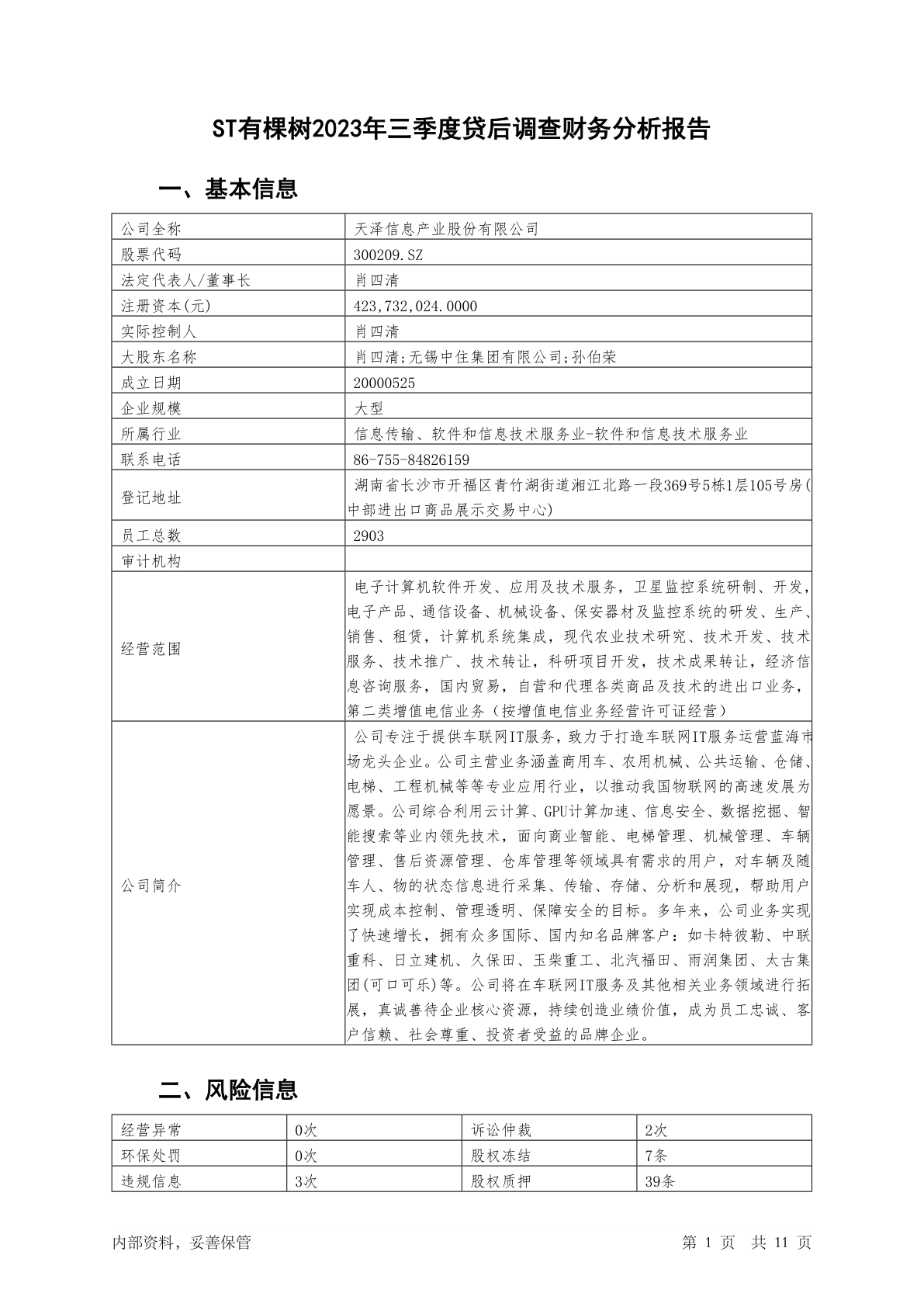 300209ST有棵树2023年三季度贷后调查财务分析报告