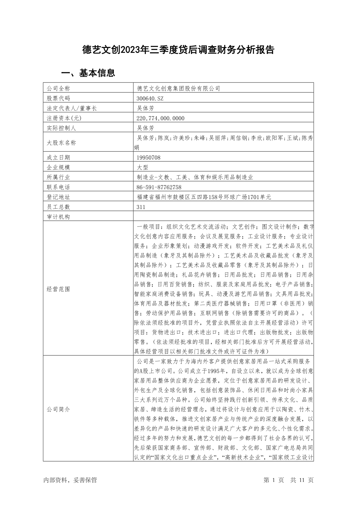 300640德艺文创2023年三季度贷后调查财务分析报告