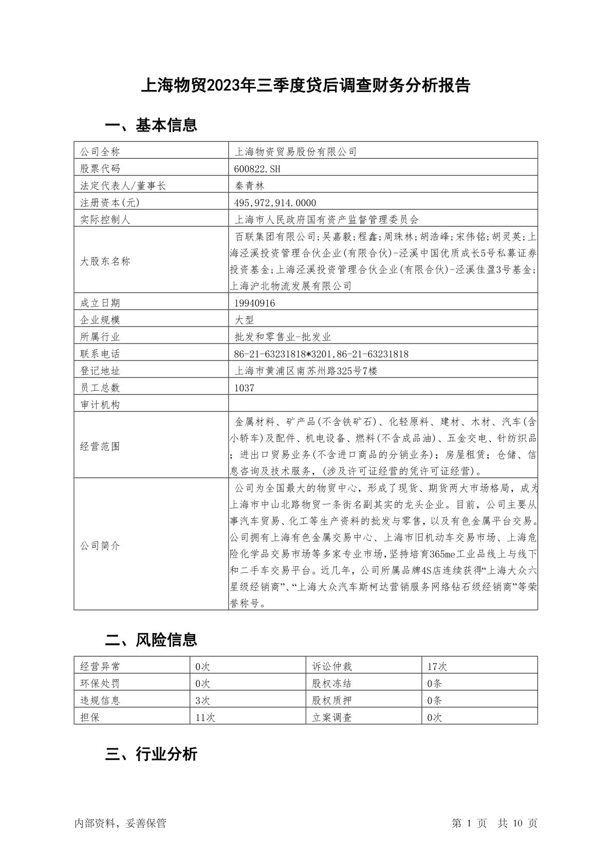 600822上海物贸2023年三季度贷后调查财务分析报告