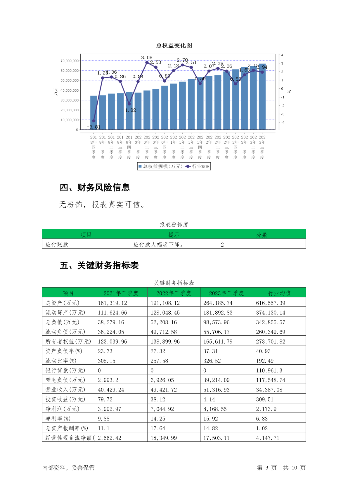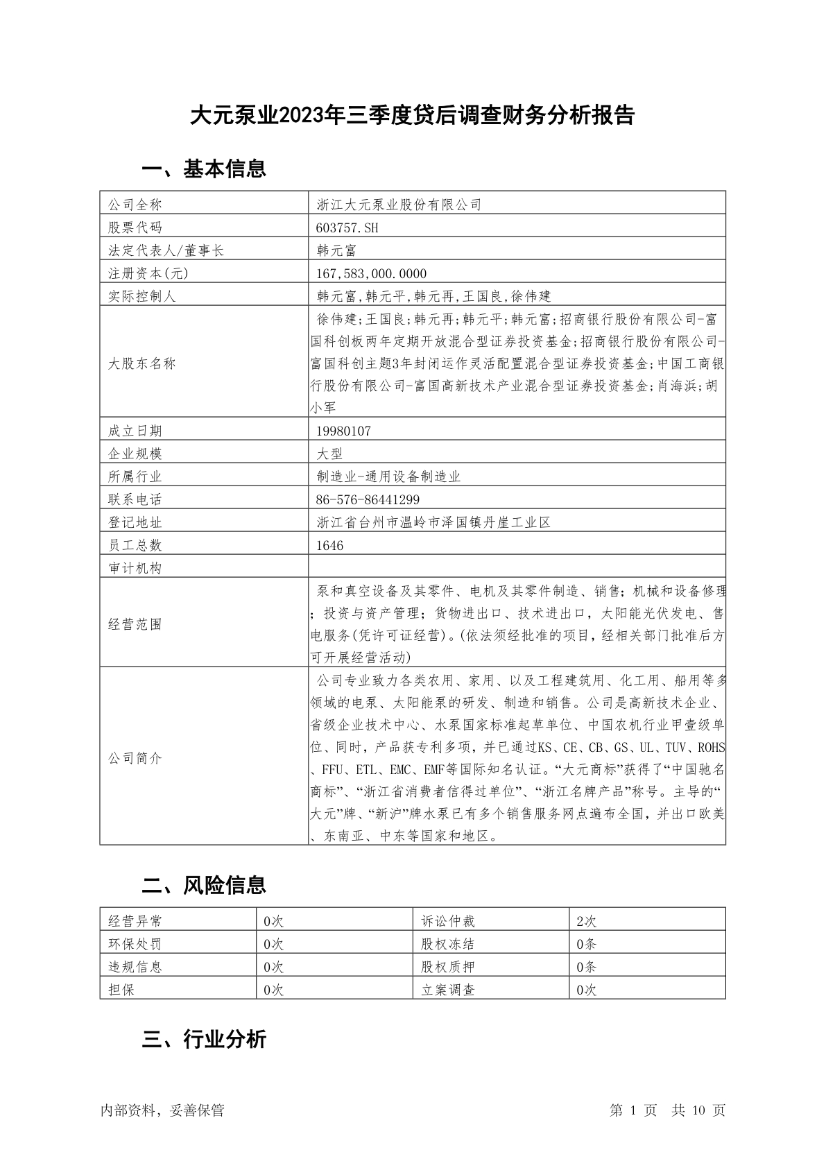 603757大元泵业2023年三季度贷后调查财务分析报告