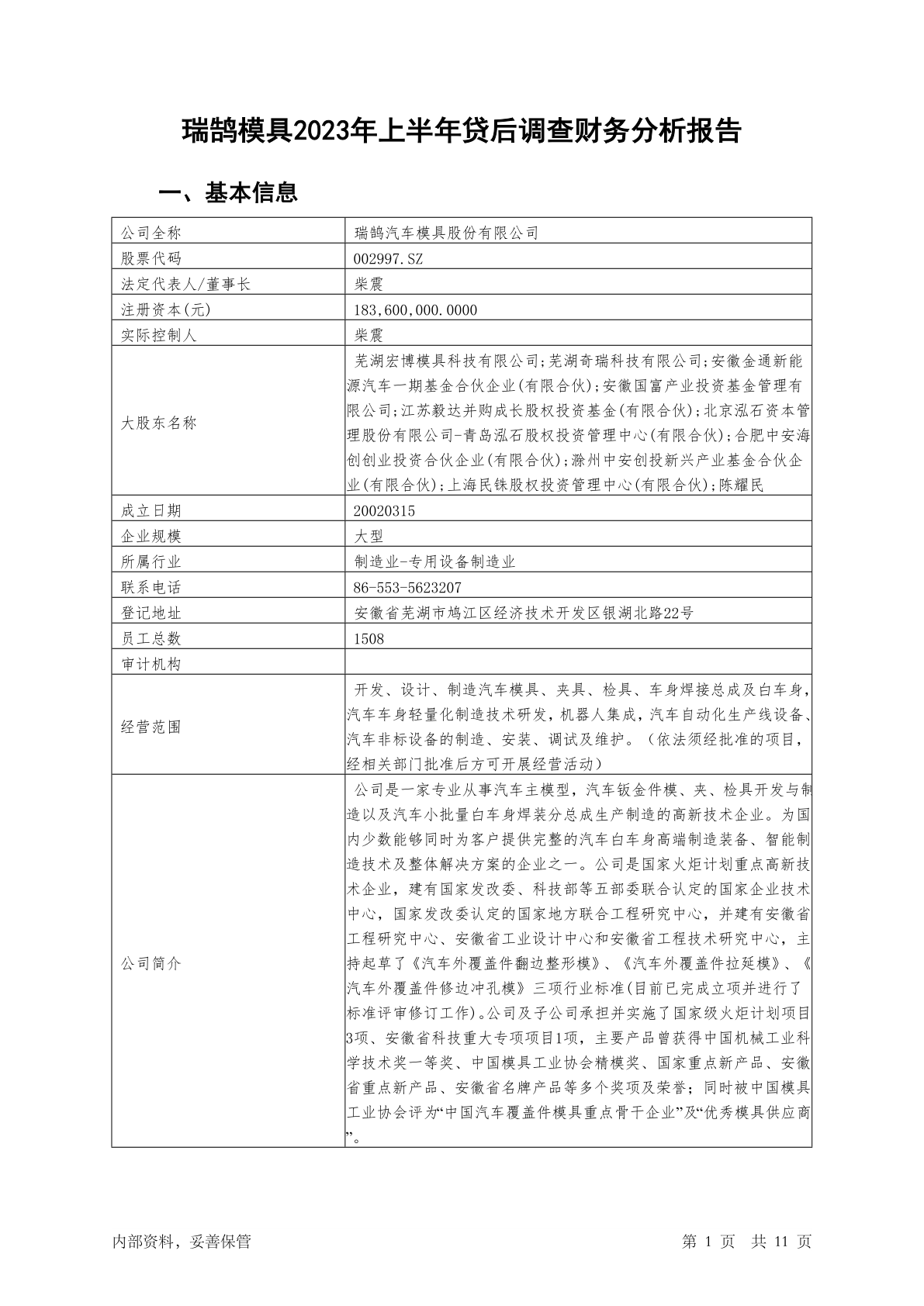 002997瑞鹄模具2023年上半年贷后调查财务分析报告