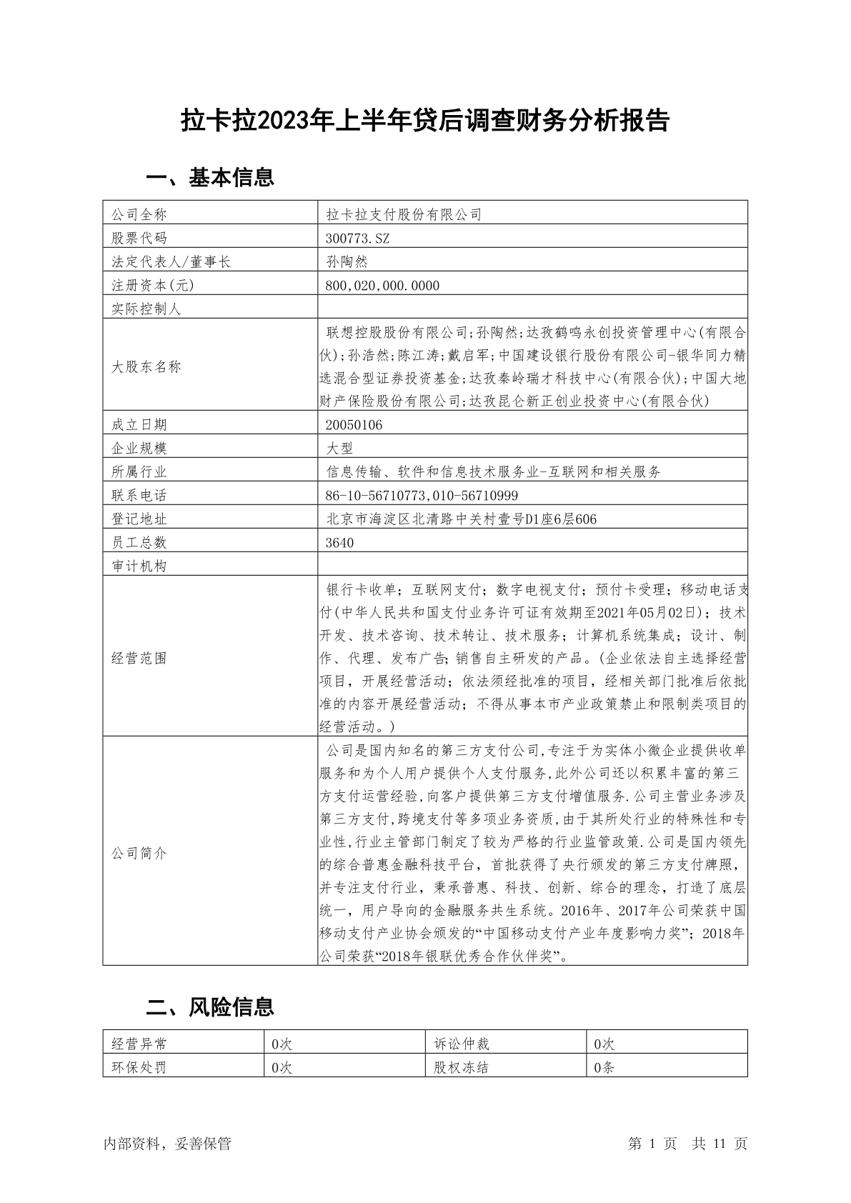 300773拉卡拉2023年上半年贷后调查财务分析报告