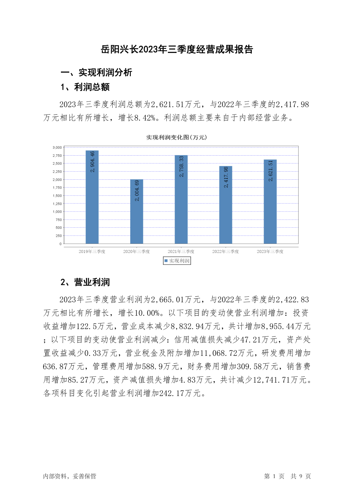 000819岳阳兴长2023年三季度经营成果报告