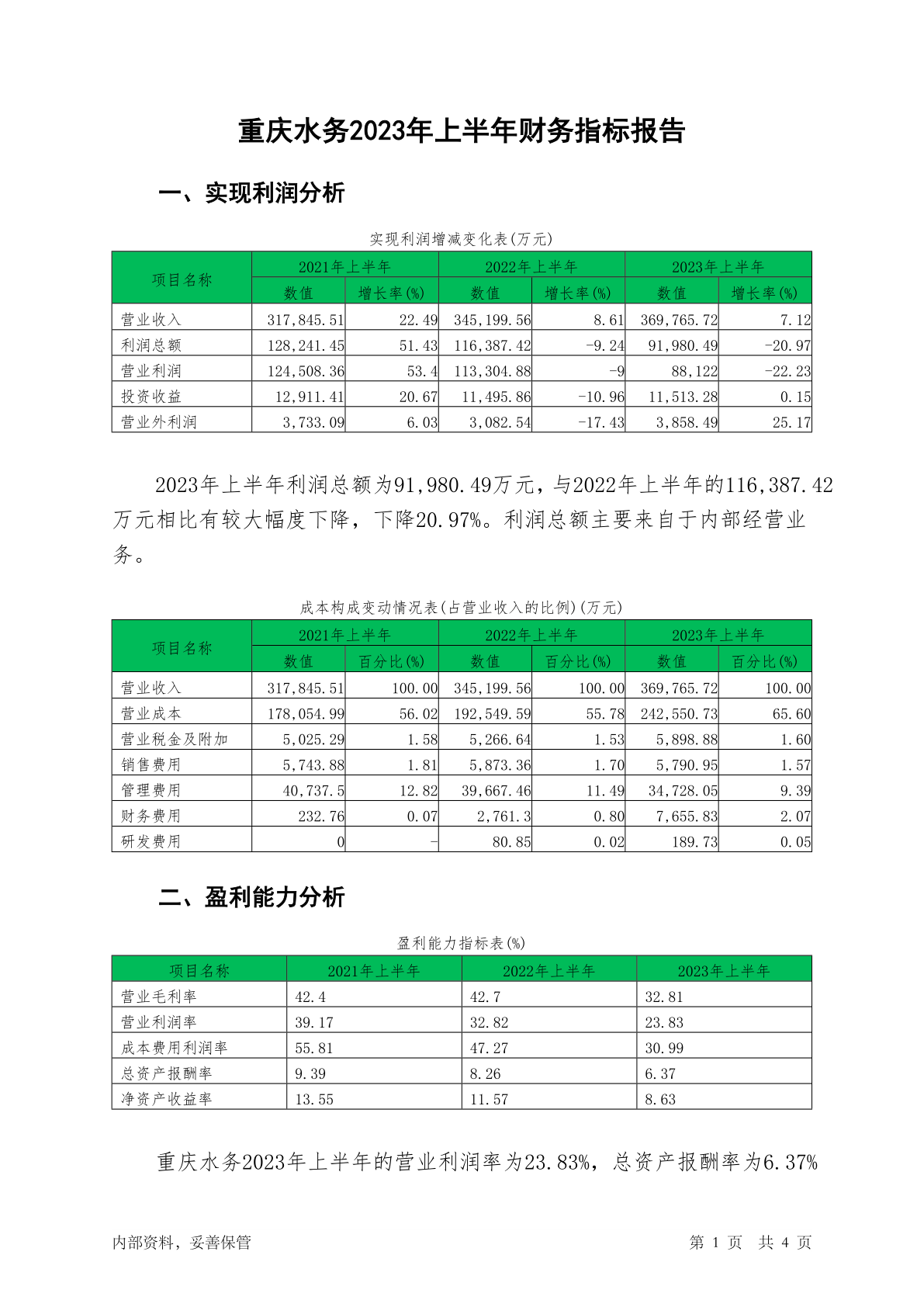 601158重庆水务2023年上半年财务指标报告