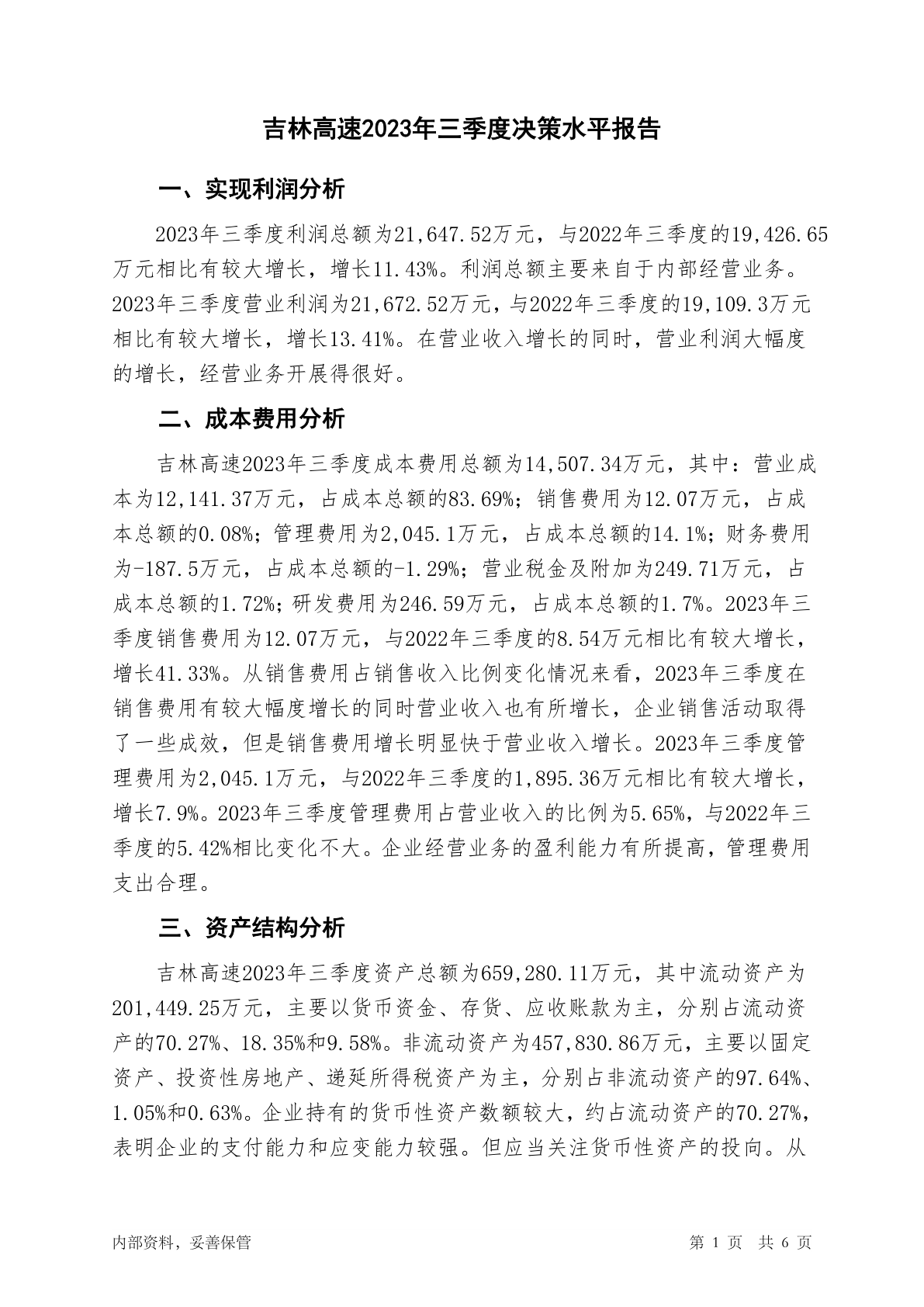 601518吉林高速2023年三季度决策水平分析报告
