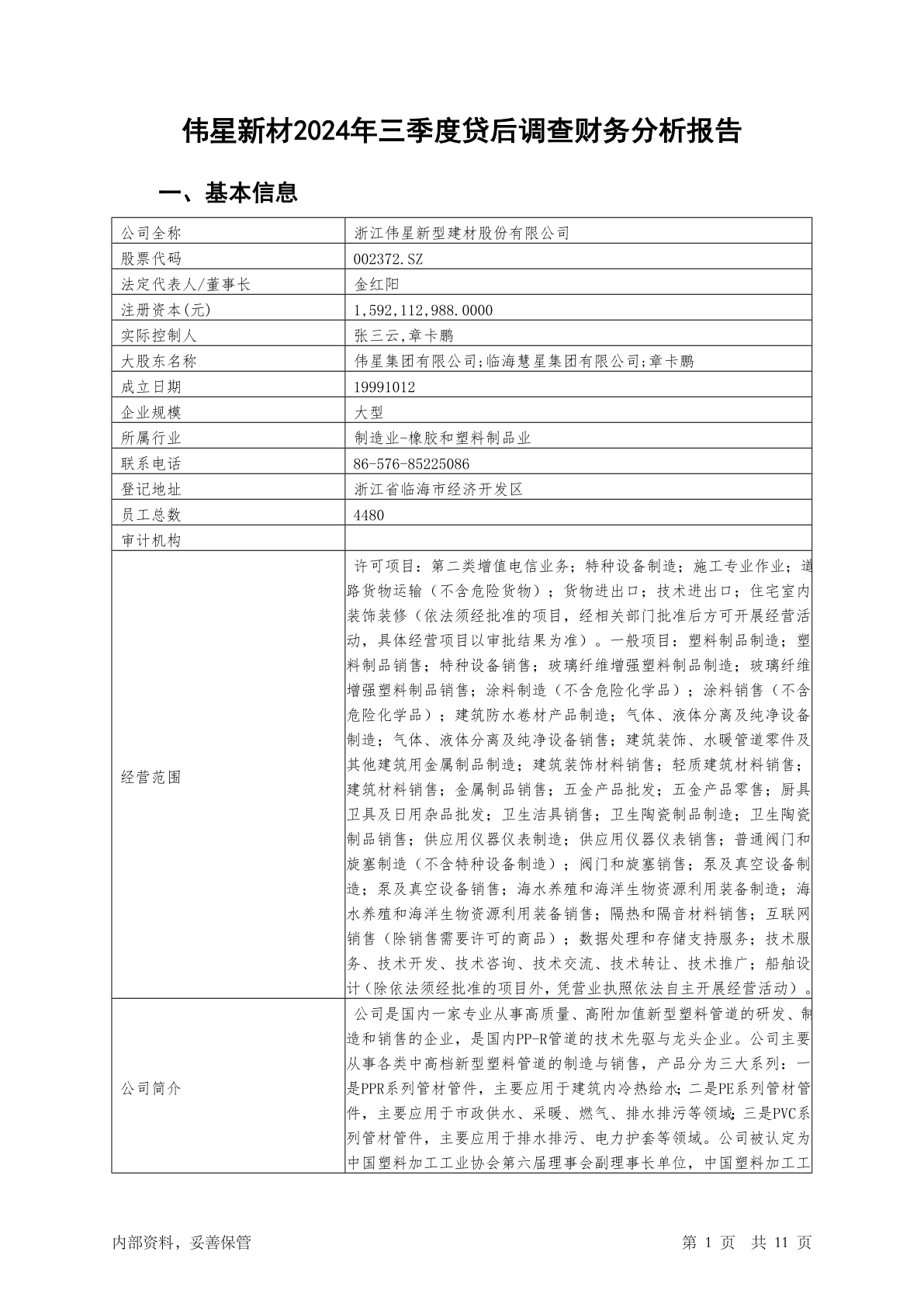 002372伟星新材2024年三季度贷后调查财务分析报告