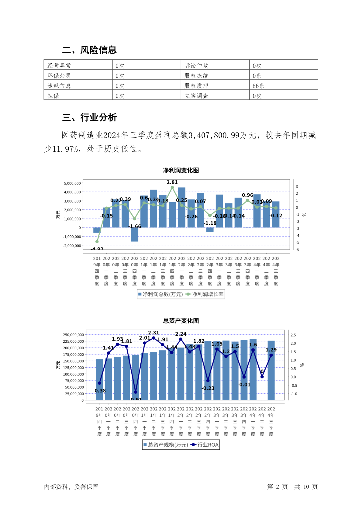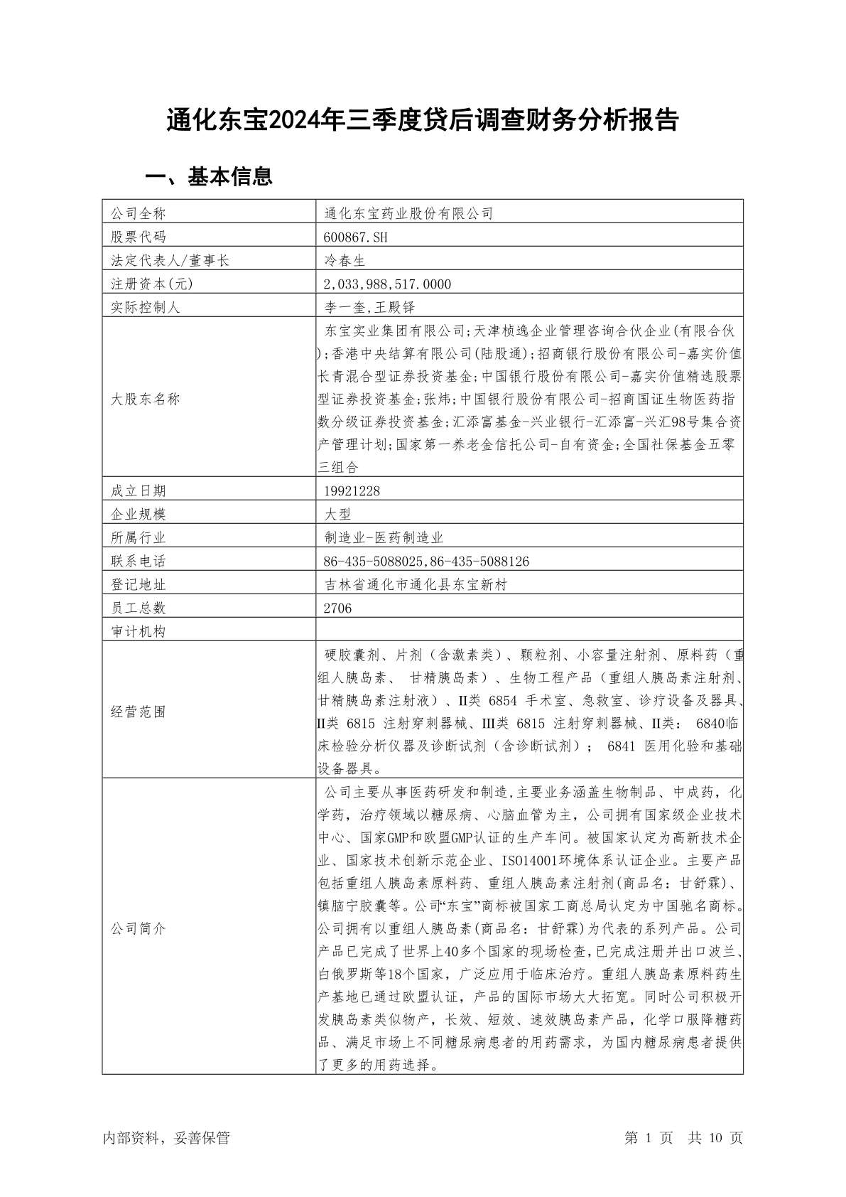 600867通化东宝2024年三季度贷后调查财务分析报告