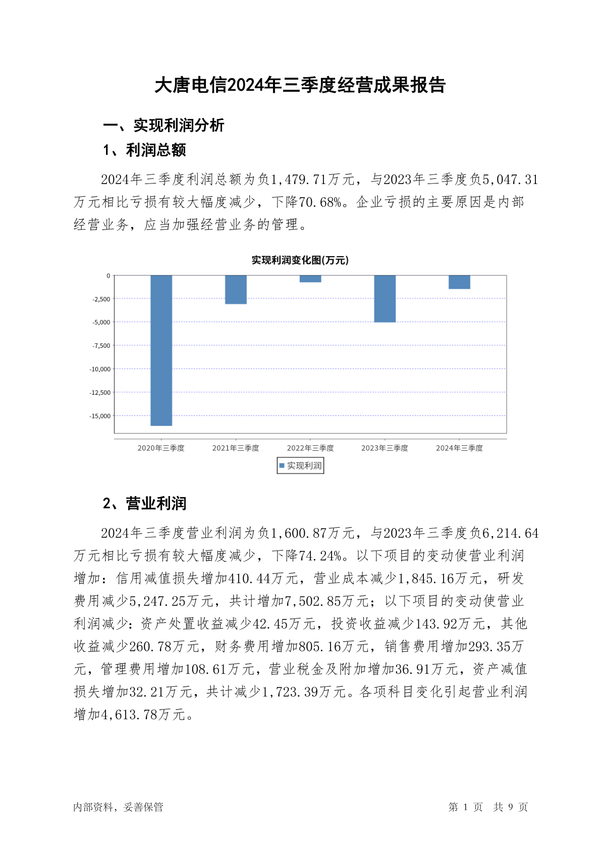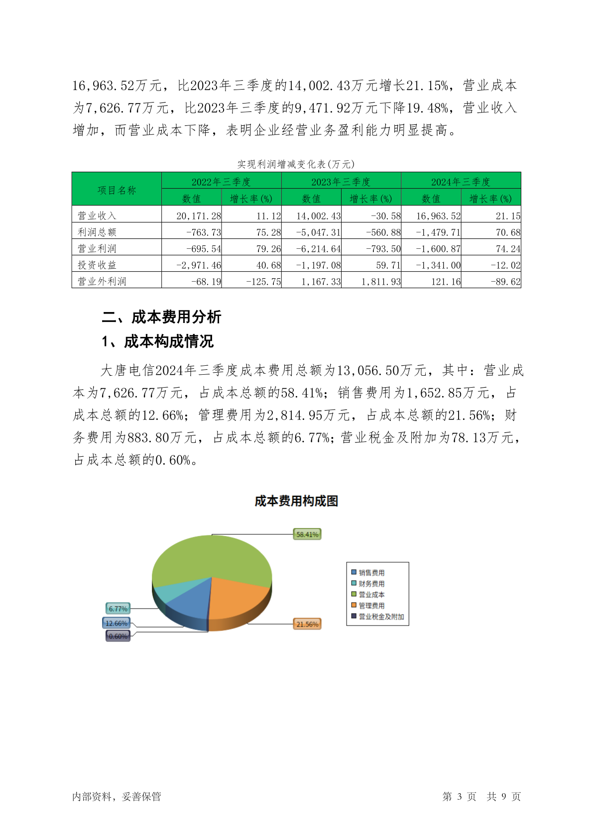 600198大唐电信2024年三季度经营成果报告