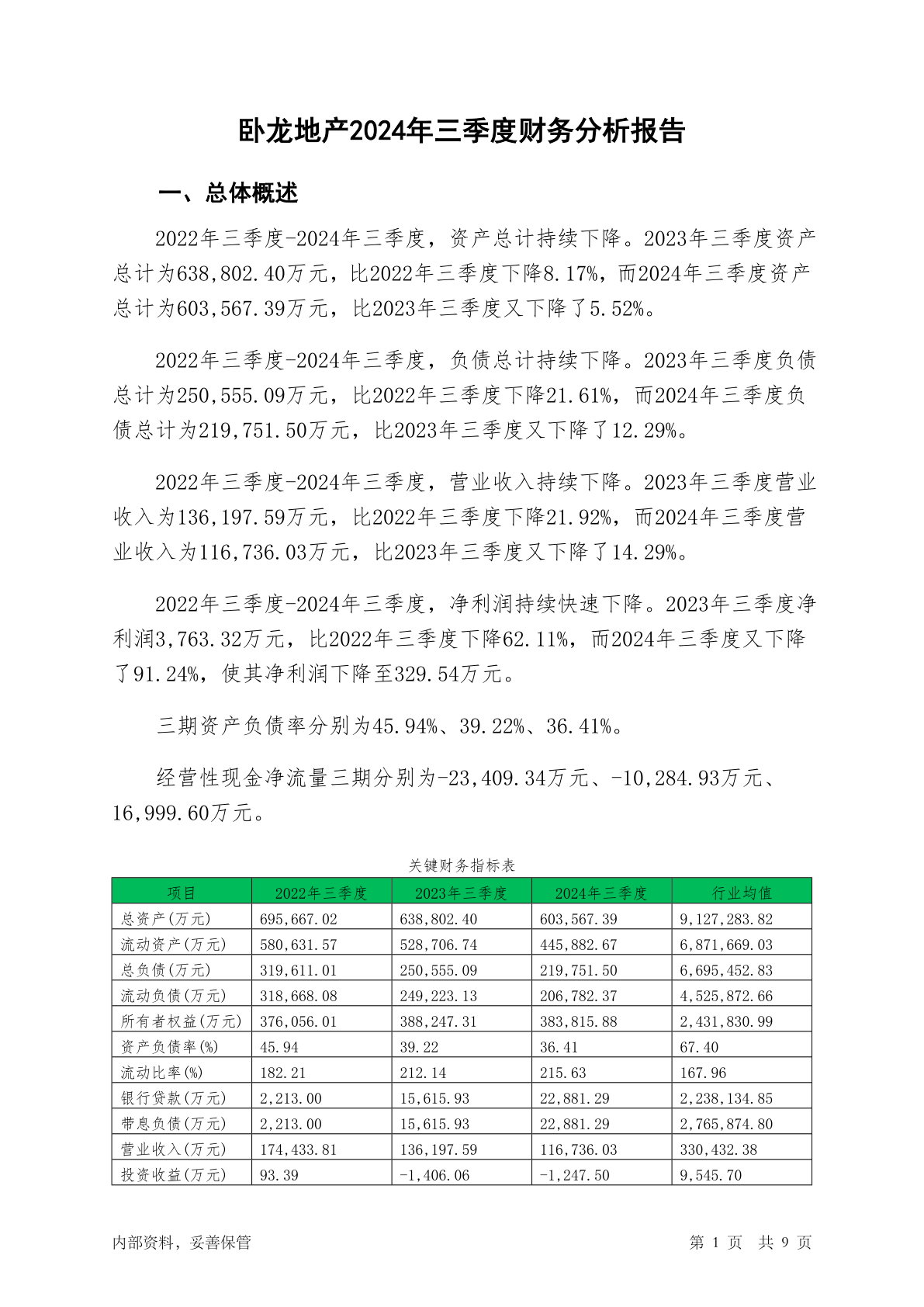 600173卧龙地产2024年三季度财务分析报告-银行版
