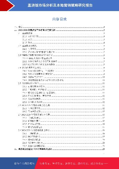 - 盖浇饭市场前景预测与本地营销策略研究报告本报告在大量周密的市场调研基础上,依据国家统计局、相关行业协会及专业研究单位等公布和提供的大量数据,采用多种研究方法,结合盛世华研监测数据及知识体系,对行业发展进行详细的阐述和深入的分析,并在此基础上提出企业未来发展战略、市场竞争战略等实战研究成果,为企业在未来发展战略、投资布局等提供可参考的路径与方向。2023年发布时间:2023-10-13