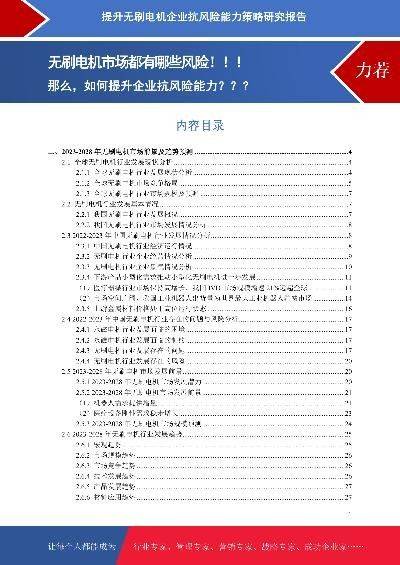 - 无刷电机企业提升抗风险能力策略研究报告本报告在大量周密的市场调研基础上,依据国家统计局、相关行业协会及专业研究单位等公布和提供的大量数据,采用多种研究方法,结合盛世华研监测数据及知识体系,对行业发展进行详细的阐述和深入的分析,并在此基础上提出企业未来发展战略、市场竞争战略等实战研究成果,为企业在未来发展战略、投资布局等提供可参考的路径与方向。2024年发布时间:2024-08-08