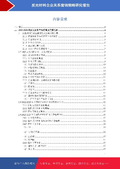 - 反光材料企业基于财务视角下发展策略研究报告本报告在大量周密的市场调研基础上,依据国家统计局、相关行业协会及专业研究单位等公布和提供的大量数据,采用多种研究方法,结合盛世华研监测数据及知识体系,对行业发展进行详细的阐述和深入的分析,并在此基础上提出企业未来发展战略、市场竞争战略等实战研究成果,为企业在未来发展战略、投资布局等提供可参考的路径与方向。2023年发布时间:2023-10-06