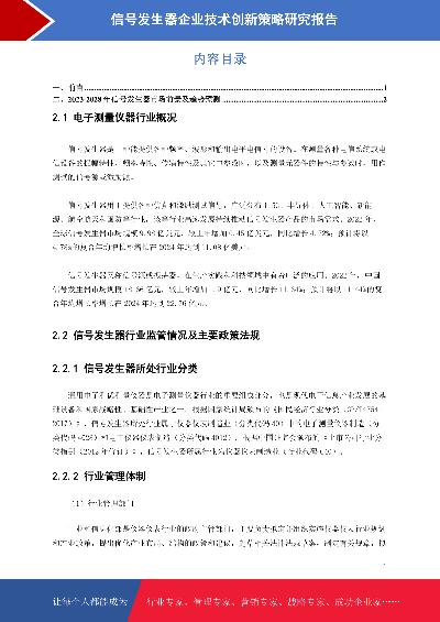 信号发生器市场前景预测与技术创新策略研究报告本报告在大量周密的市场调研基础上,依据国家统计局、相关行业协会及专业研究单位等公布和提供的大量数据,采用多种研究方法,结合盛世华研监测数据及知识体系,对行业发展进行详细的阐述和深入的分析,并在此基础上提出企业未来发展战略、市场竞争战略等实战研究成果,为企业在未来发展战略、投资布局等提供可参考的路径与方向。2023年发布时间:2023-10-06