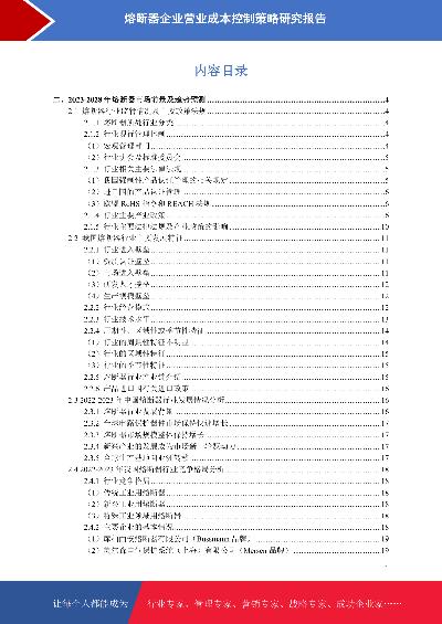 - 熔断器企业营业成本控制策略研究报告本报告在大量周密的市场调研基础上,依据国家统计局、相关行业协会及专业研究单位等公布和提供的大量数据,采用多种研究方法,结合盛世华研监测数据及知识体系,对行业发展进行详细的阐述和深入的分析,并在此基础上提出企业未来发展战略、市场竞争战略等实战研究成果,为企业在未来发展战略、投资布局等提供可参考的路径与方向。2023年发布时间:2024-01-01