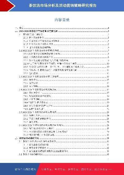 茶饮店市场前景预测与活动促销策略研究报告本报告在大量周密的市场调研基础上,依据国家统计局、相关行业协会及专业研究单位等公布和提供的大量数据,采用多种研究方法,结合盛世华研监测数据及知识体系,对行业发展进行详细的阐述和深入的分析,并在此基础上提出企业未来发展战略、市场竞争战略等实战研究成果,为企业在未来发展战略、投资布局等提供可参考的路径与方向。2023年发布时间:2023-10-22