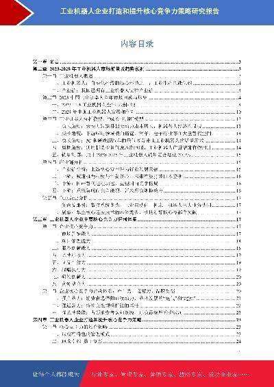 工业机器人企业提升核心竞争力策略研究报告本报告在大量周密的市场调研基础上,依据国家统计局、相关行业协会及专业研究单位等公布和提供的大量数据,采用多种研究方法,结合盛世华研监测数据及知识体系,对行业发展进行详细的阐述和深入的分析,并在此基础上提出企业未来发展战略、市场竞争战略等实战研究成果,为企业在未来发展战略、投资布局等提供可参考的路径与方向。2024年发布时间:2024-03-24