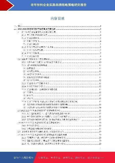 - 老年饮料企业品牌力和生命力打造策略研究报告本报告在大量周密的市场调研基础上,依据国家统计局、相关行业协会及专业研究单位等公布和提供的大量数据,采用多种研究方法,结合盛世华研监测数据及知识体系,对行业发展进行详细的阐述和深入的分析,并在此基础上提出企业未来发展战略、市场竞争战略等实战研究成果,为企业在未来发展战略、投资布局等提供可参考的路径与方向。2023年发布时间:2023-11-04