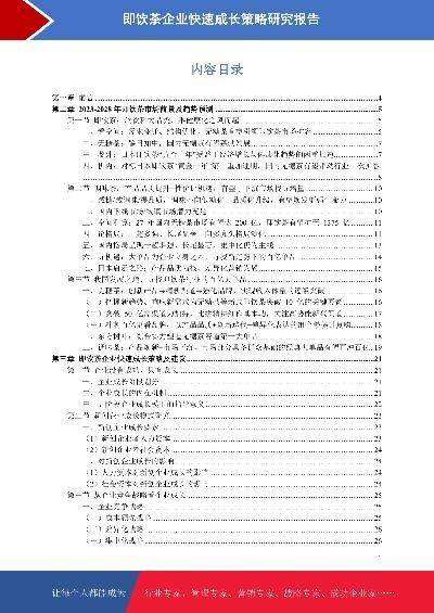 即饮茶市场前景预测与私域运营策略研究报告本报告在大量周密的市场调研基础上,依据国家统计局、相关行业协会及专业研究单位等公布和提供的大量数据,采用多种研究方法,结合盛世华研监测数据及知识体系,对行业发展进行详细的阐述和深入的分析,并在此基础上提出企业未来发展战略、市场竞争战略等实战研究成果,为企业在未来发展战略、投资布局等提供可参考的路径与方向。2024年发布时间:2024-06-29