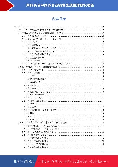 - 原料药及中间体企业销售渠道管理策略研究报告本报告在大量周密的市场调研基础上,依据国家统计局、相关行业协会及专业研究单位等公布和提供的大量数据,采用多种研究方法,结合盛世华研监测数据及知识体系,对行业发展进行详细的阐述和深入的分析,并在此基础上提出企业未来发展战略、市场竞争战略等实战研究成果,为企业在未来发展战略、投资布局等提供可参考的路径与方向。2023年发布时间:2023-07-31