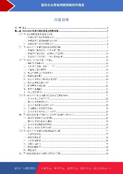 - 畜牧企业提升抗风险能力策略研究报告本报告在大量周密的市场调研基础上,依据国家统计局、相关行业协会及专业研究单位等公布和提供的大量数据,采用多种研究方法,结合盛世华研监测数据及知识体系,对行业发展进行详细的阐述和深入的分析,并在此基础上提出企业未来发展战略、市场竞争战略等实战研究成果,为企业在未来发展战略、投资布局等提供可参考的路径与方向。2024年发布时间:2024-03-23