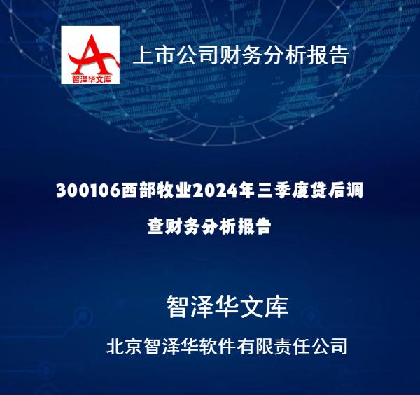 300106西部牧业2024年三季度贷后调查财务分析报告北京智泽华公司将各个国家和国内外主要研究机构、咨询机构在实践中所使用的财务分析、经营评价和内部控制技术汇集起来,然后经过取粗存精、科学提炼和实践检验等加工研究过程,提出了一套独特的完全拥有自主知识产权的分析和控制理论与方法。这套分析控制方法从经营管理者如何通过财务数据来把握企业的经营、管理和决策,确保企业长期、稳定、健康发展的角度出发,重新设计、定义、完善和解释了财务分析和经营控制的指标。2024年发布时间:2024-10-05