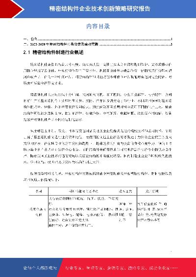 - 精密结构件市场前景预测与技术创新策略研究报告本报告在大量周密的市场调研基础上,依据国家统计局、相关行业协会及专业研究单位等公布和提供的大量数据,采用多种研究方法,结合盛世华研监测数据及知识体系,对行业发展进行详细的阐述和深入的分析,并在此基础上提出企业未来发展战略、市场竞争战略等实战研究成果,为企业在未来发展战略、投资布局等提供可参考的路径与方向。2023年发布时间:2023-10-06