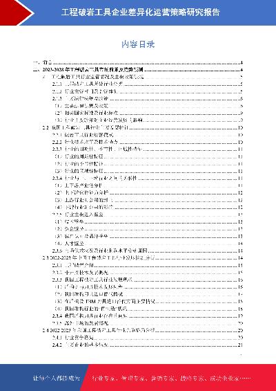 - 工程破岩工具市场前景预测与差异化运营策略研究报告本报告在大量周密的市场调研基础上,依据国家统计局、相关行业协会及专业研究单位等公布和提供的大量数据,采用多种研究方法,结合盛世华研监测数据及知识体系,对行业发展进行详细的阐述和深入的分析,并在此基础上提出企业未来发展战略、市场竞争战略等实战研究成果,为企业在未来发展战略、投资布局等提供可参考的路径与方向。2023年发布时间:2023-10-13