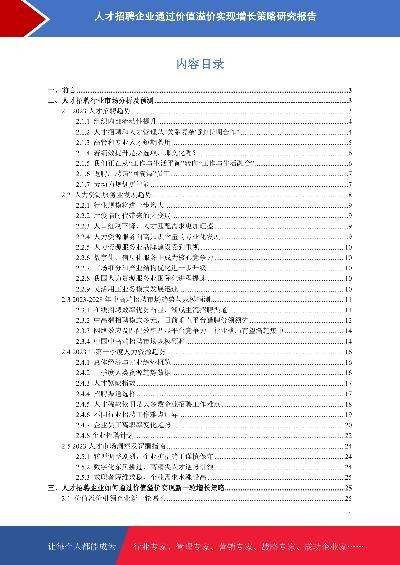 - 人才招聘企业如何通过价值溢价实现新一轮增长策略研究报告本报告在大量周密的市场调研基础上,依据国家统计局、相关行业协会及专业研究单位等公布和提供的大量数据,采用多种研究方法,结合盛世华研监测数据及知识体系,对行业发展进行详细的阐述和深入的分析,并在此基础上提出企业未来发展战略、市场竞争战略等实战研究成果,为企业在未来发展战略、投资布局等提供可参考的路径与方向。2023年发布时间:2023-07-31